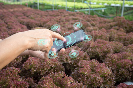 The farmer holds a smartphone and touches the screen to connect the intelligent management system within the farm. smart farmers research and market information online.