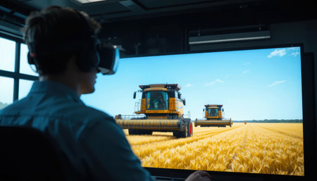 Man uses a virtual reality headset to view farm machinery in a wheat field on the monitor.