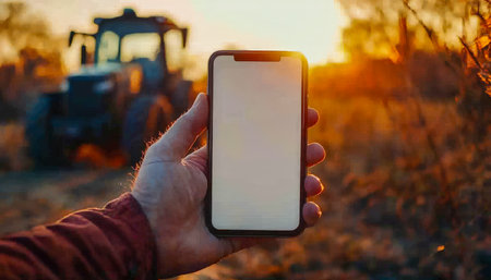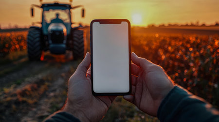 A farmer stands in a field, focused on using a smartphone while a tractor looms in the background. The setting showcases a beautiful sunrise or sunset, highlighting the intersection of technology and traditional farming life.