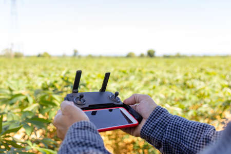 An Asian farmer uses agricultural drones to detect damage and growth of the crops he grows on his farm