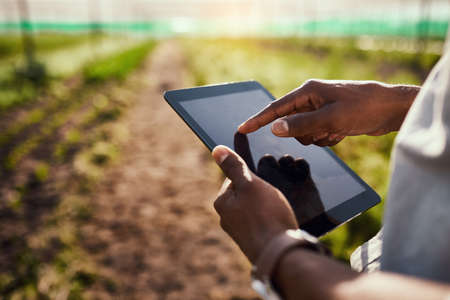 The farm at his fingertips. Cropped shot of an unrecognizable male farmer using a tablet while working on his farm.