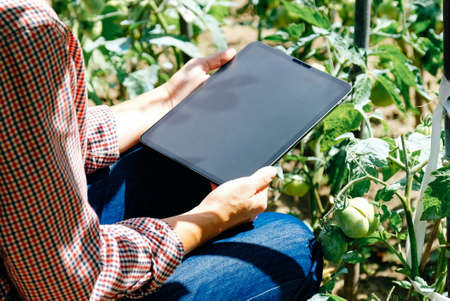 Farmer in greenhouse checking tomato plants using digital tablet. Agriculture innovative technology concept.