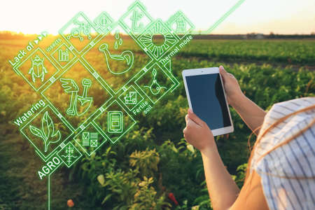 Female farmer using iot application while working in field. Smart farming and digital agriculture