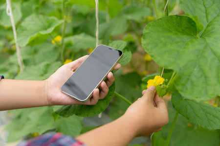 Young man Asian farmer using smartphone in organic cucumber greenhouse farm