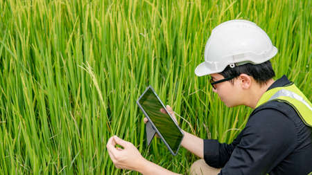 Asian male agronomist or agricultural engineer holding rice spike inspecting green rice field with digital tablet for the agronomy research. Agriculture and technology concepts