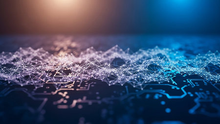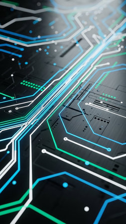 Close-up view of an abstract circuit board design featuring glowing blue lights and intricate connections, representing technology and innovation themes.