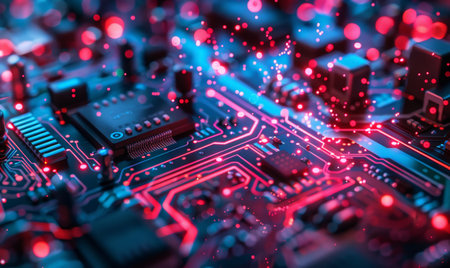 Macro view of an electronic circuit board illuminated with vibrant blue and pink neon lighting, showcasing...