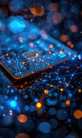 Abstract image of a smartphone with a blue glowing network structure on the screen. The network structure is made up of multiple nodes and connections, representing a complex system or network.