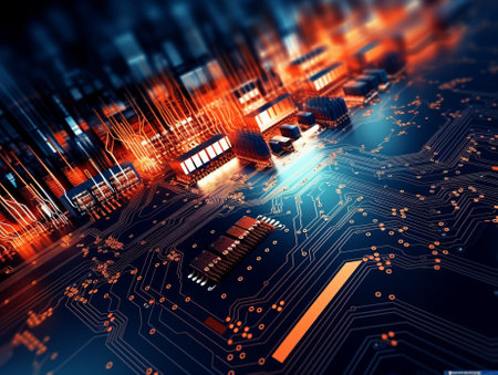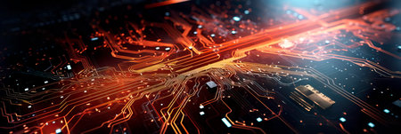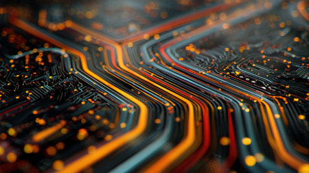 Futuristic circuit board close-up with vibrant blue and orange lines, creating a dynamic, tech-inspired abstract scene.