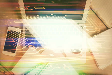 Multi exposure of data theme drawing hologram over topview work desk background with computer. Concept of technology.
