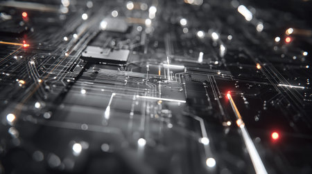 A stunning close-up view of a futuristic circuit board filled with glowing lights and intricate electronic pathways, representing advanced technology in action.