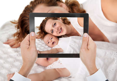 Mother make a portrait of her baby on mobile phone.