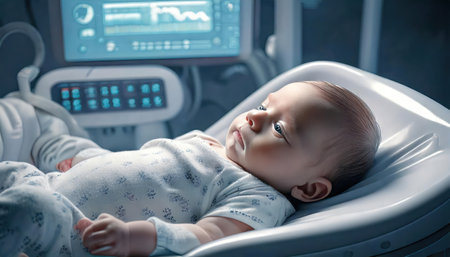 Newborn resting in a high-tech nursery surrounded by glowing screens and advanced medical equipment