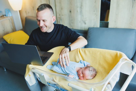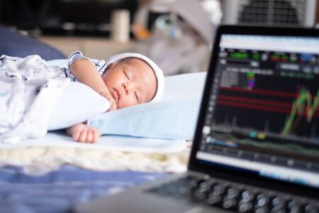 Soft focus on baby .The parents father Stock trader trading stock on his laptop while his newborn infant baby sleep on the bed