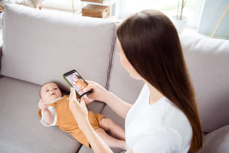 Photo of positive blogger influencer mother hold phone take little son picture lay divan wear casual outfit home indoors