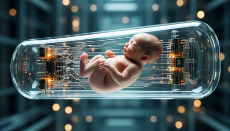 Futuristic baby in glass pod on a technological backdrop, emphasizing themes of artificial intelligence, innovation, and digital transformation