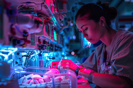 A focused healthcare professional tends to newborns in a state-of-the-art neonatal intensive care unit bathed in soothing neon light.