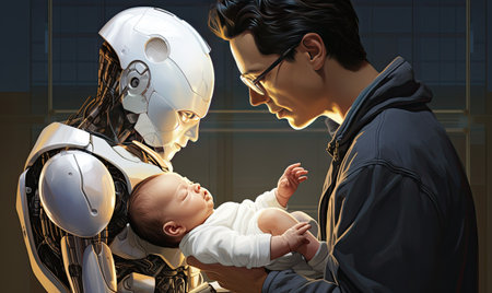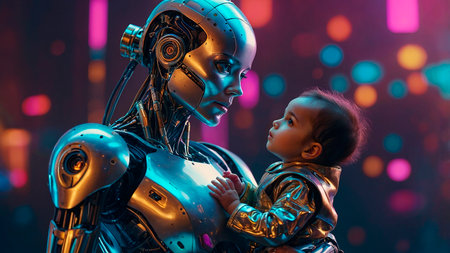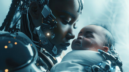 Emotive Science Fiction Scene: Humanoid Robot and Infant in a Tender Embrace - A Blend of Artificial Intelligence and Human Connection