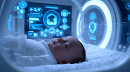 Futuristic newborn in a glass pod surrounded by glowing circuit patterns, symbolizing technology and innovation in a digital age