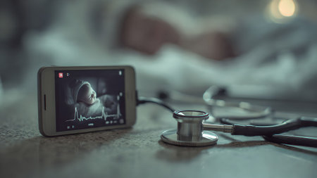 Modern baby monitoring system with a smartphone displaying the baby and a stethoscope on a table in a hospital.