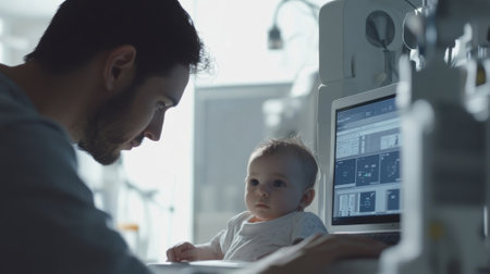 Doctor examining medical scan results of baby patient using laptop in hospital room