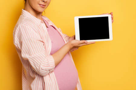 cropped view of pregnant woman showing digital tablet with blank screen on yellow