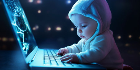 Generative AI : baby girl with laptop and credit card shopping on the Internet