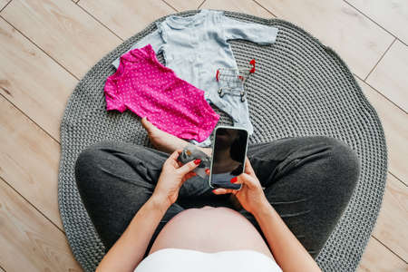 Pregnant woman with a phone in her hands, top view. Online shopping concept.