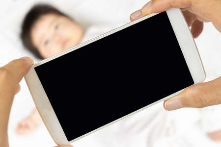 Mother hand hold mobile phone to take a photo of newborn baby during she is sleeping on white bed.