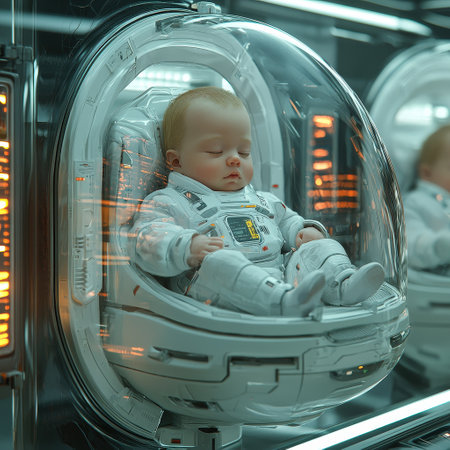 Sleeping Baby in Advanced Space Pod with Technology Display