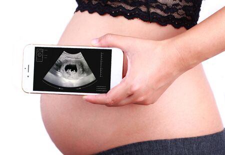 Pregnant woman hand holding smart phone with ultrasound scan on display.