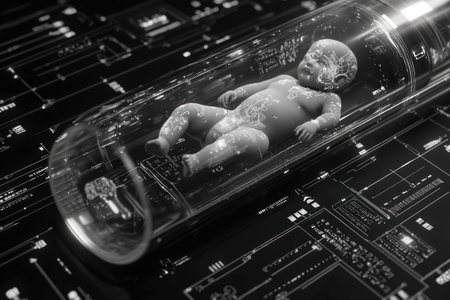 Futuristic concept of a baby incubated in a glass tube surrounded by digital technology, representing artificial intelligence and advanced science