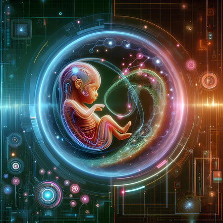 Futuristic concept of a digital baby within a glowing, tech-inspired cocoon, representing the intersection of technology and human life.
