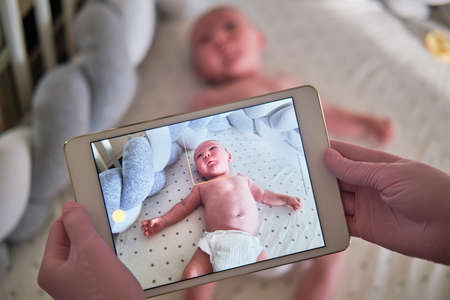 Monitoring of a newborn baby in a crib through a home security camera online and the Internet in a mobile phone