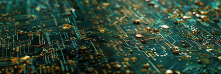 Computer electronics manufacturing industry, motherboard complex circuitry, generic circuit board electrical parts components macro, object detail, extreme closeup, shallow dof, nobody, technology
