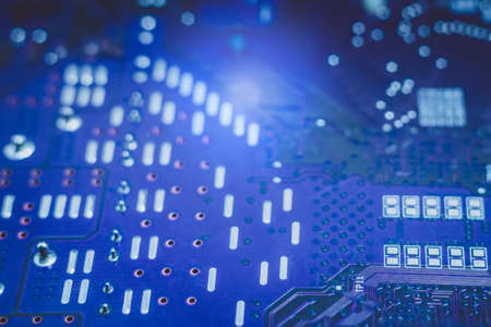 Blue electronic motherboard circuit close up macro background