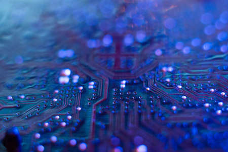 Computer motherboard, microchips close-up in color illumination,