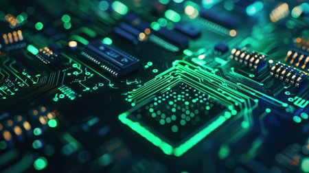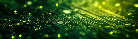 Abstract image of a green circuit board with glowing lights, representing technology and electronics. Perfect for backgrounds, designs, and visual concepts in digital innovation.