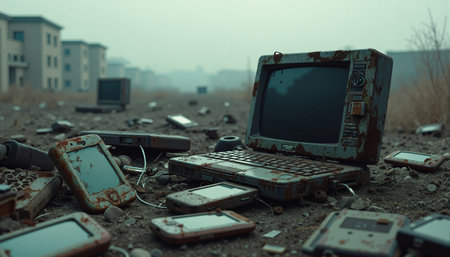 An apocalyptic scene featuring rusted and decayed electronic devices, including an old laptop and smartphones, scattered across a barren, dusty landscape with abandoned buildings in the hazy background. The image evokes themes of technological decay and obsolescence.