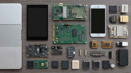 Intricate smartphone components displayed on flat surface, showing advanced internal technology