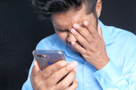 Sad, worried, anxious adult bearded man looking at his smartphone. Guy having problem with technology, being confused after checking social media, front camera.