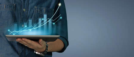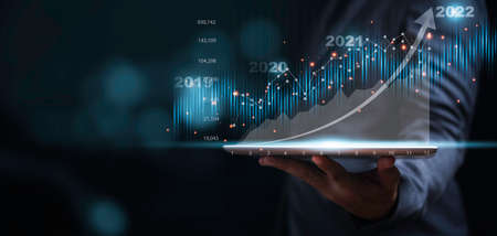 The concept is business strategy. Abstract icon. Digital marketing. Businessman using tablet analyzing sales data and economic growth graph chart.