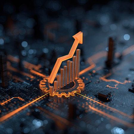 An artistic representation features an illuminated orange growth chart against a dark, textured background. The image presents a conceptual depiction, using vibrant orange light, emphasizing a sense of progress and innovation. Suitable for use in financial, technological, or business publications, the illustration is designed with a modern aesthetic.