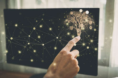 Man using smartphone trading business stock or bitcoin graph. Crypto currency growth in blockchain technology.