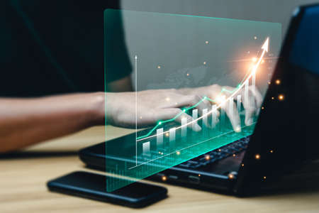 hand of businessman interactive touching a holographic financial growth arrow graph chart system network and technology, success of trading innovation