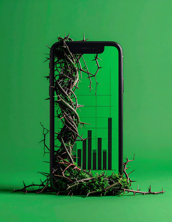 A smartphone displaying a financial growth chart is entwined with overgrown vines, symbolizing the powerful intersection of sustainable investment, green technology, and ESG principles.