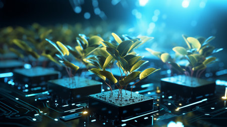 Plants growing on a circuit board symbolizing technology and nature concept, AI Generated