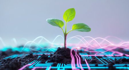 A vibrant green seedling emerges from a microchip, conveying innovation, environmental consciousness, and the potential for digital-driven natural pro