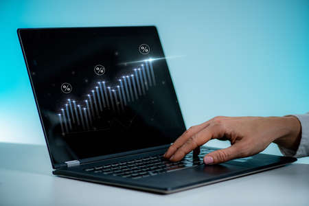 Trader using laptop computer with technical graph and chart for analysis stock market to investment concept.