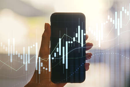 Abstract creative financial graph and hand with mobile phone on background, financial and trading concept. Multiexposure
